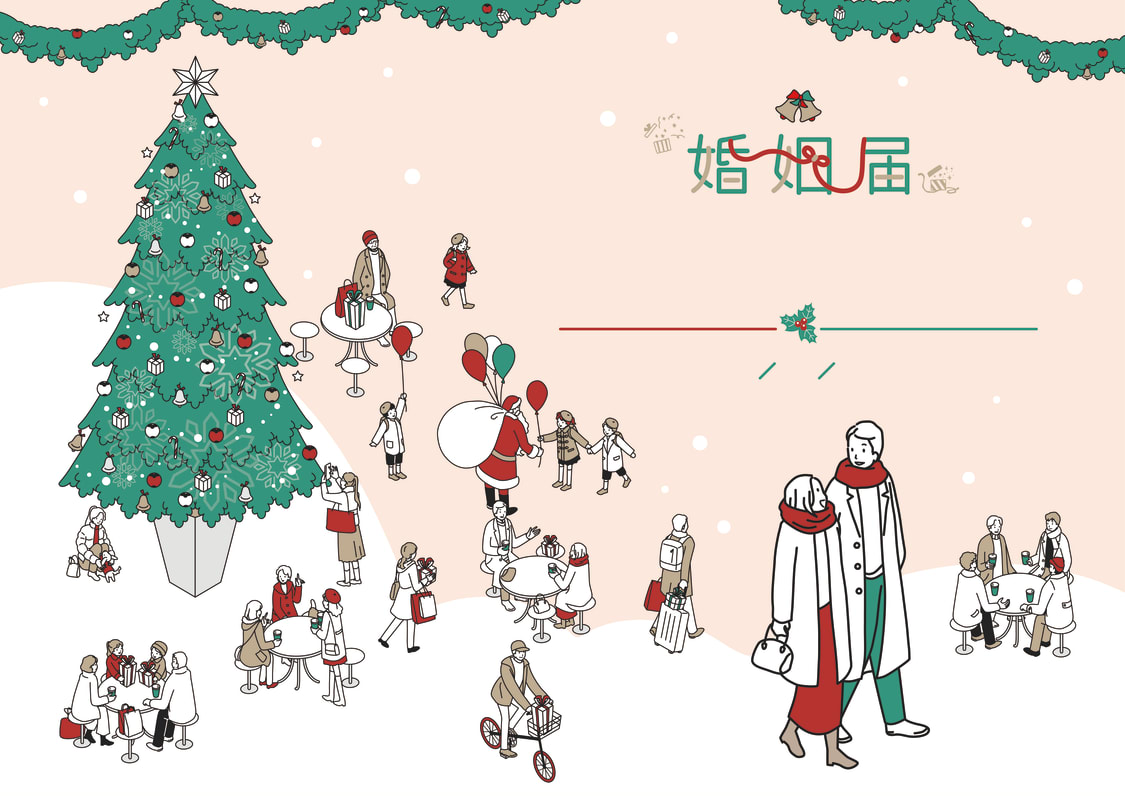 クリスマスの華やかでにぎやかな街の様子をあしらいにして、お二人のご結婚をよりハッピーであたたかにお祝い出来ればと思います!